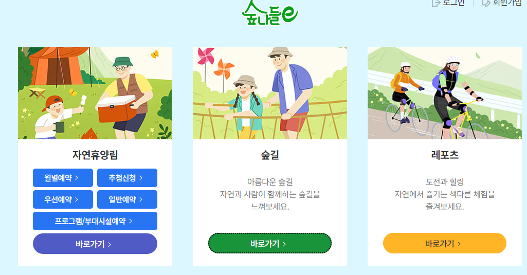 숲나들e 홈페이지에 회원가입을 한 후 로그인을 통해 예약 신청이 가능합니다. 회원가입은 필수이며, 간단한 개인정보 입력으로 진행됩니다.