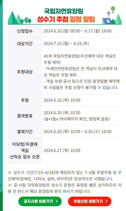 - 결과 발표: 2024년 6월 20일(목) 10:00 (숲나들e 마이페이지 및 알림톡 발송)