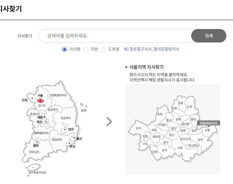 '지사찾기' 메뉴를 클릭하면 지역과 지사명을 선택할 수 있는 화면이 나타납니다. 원하는 지역과 지사명을 선택하거나 지도를 클릭하여 해당 지역의 지사를 검색할 수 있으며, 검색 결과에서 원하는 지사를 선택하면 해당 지사의 상세 정보를 확인할 수 있습니다.