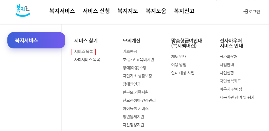 메인 페이지 상단메뉴에서 복지서비스 >서비스찾기> 서비스 목록을 선택합니다.