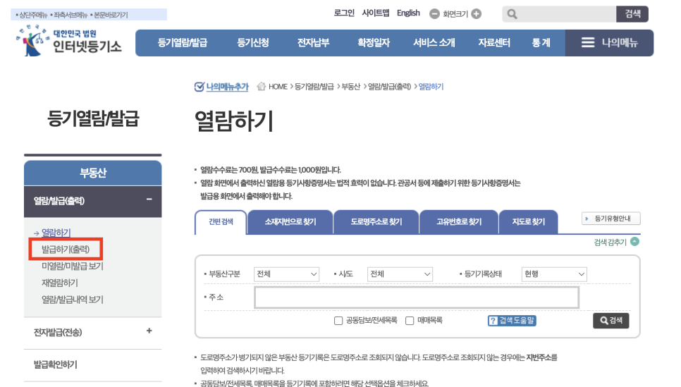 홈페이지에 접속하면 바로 부동산 등기 - 열람/발급(출력) 항목이 보이실 거예요. 바로 클릭하시면 됩니다.