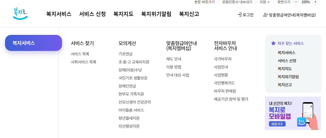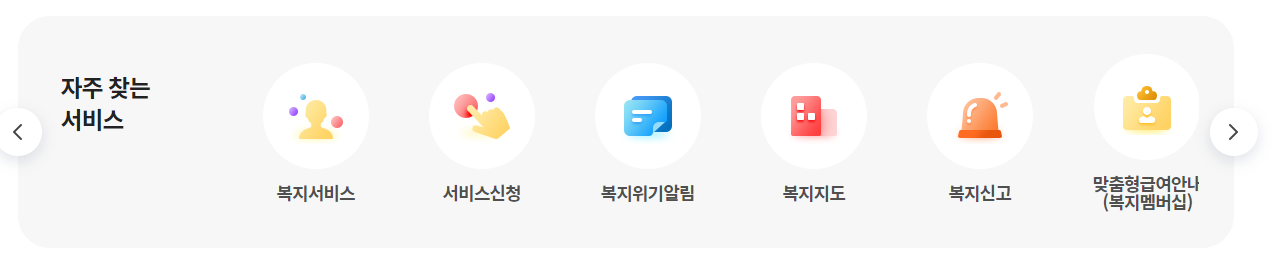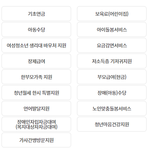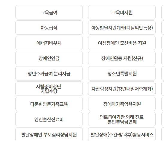 다양한 복지 서비스에 대한 정보를 제공합니다. 여기에는 생계지원, 의료지원, 주거지원, 교육지원, 돌봄서비스 등이 포함됩니다. 각각의 서비스에 대해 상세히 안내되어 있어, 필요한 정보를 쉽게 찾을 수 있습니다.