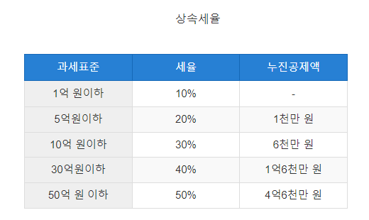 상속세 산출액은 과세표준에 세율을 곱한것으로 계산하며 세율은 최저 10%부터 최고 50%까지 총 5단계의 누진세로 나눠집니다. 아래표를 참고 바랍니다.