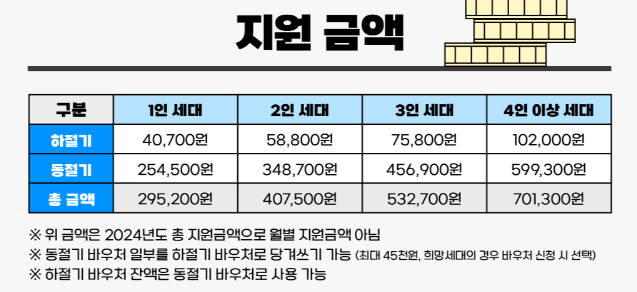 4인 이상 가구: 70만 원 (여름 10만 원/겨울 60만 원)