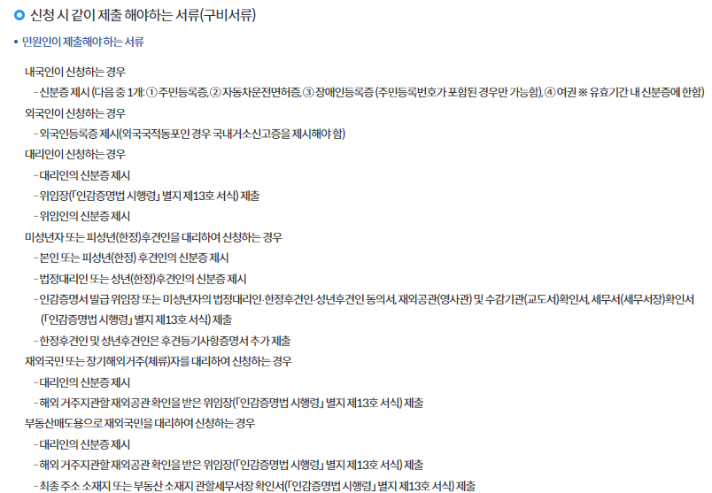 미성년자나 피한정후견인의 경우 법정 대리인의 동의서와 신분증, 후견등기사항증명서가 추가로 필요하니 이 점 유의해주세요.