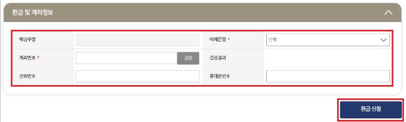 6.환급금을 지급받을 계좌번호와 예금주명 등의 정보를 입력하고 환급신청을 클릭합니다.
