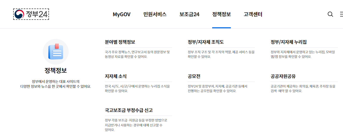 정부 24는 대한민국의 중앙 행정 기관에서 제공하는 통합 전자정부 서비스입니다.