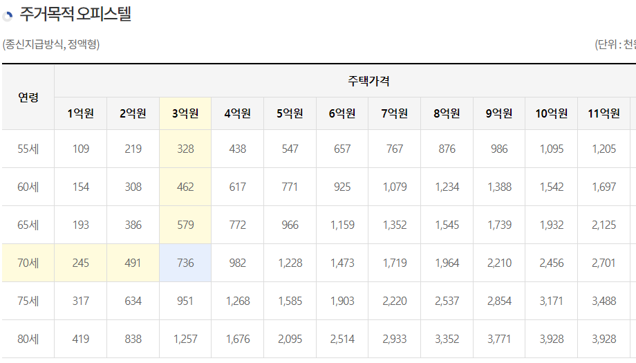 주거목적으로 살고 있는 오피스텔은 3억,70세 기준으로 봤을 때, 736,000원을 매월 받을 수 있습니다.