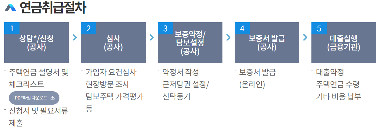 보증서가 발급되면 가입자는 해당 금융기관을 방문하여 대출 약정을 체결하고 월 지급금을 수령할 수 있고, 담 보 설정에 따른 비용 등이 발생하며, 비용은 첫 번째 월 지급금을 받을 때 은행에서 정산됩니다.