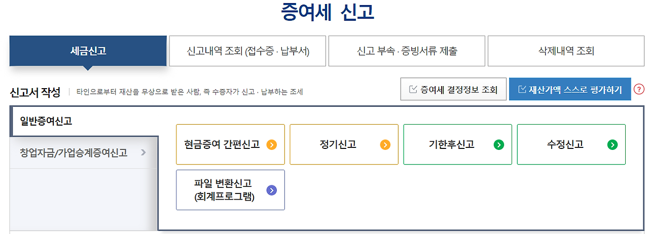 홈택스에서 증여세 신고방법을 확인해 보고 싶다면, 홈택스 - 신고/납부 - 증여세 탭에서 계산을 해보실 수 있습니다.