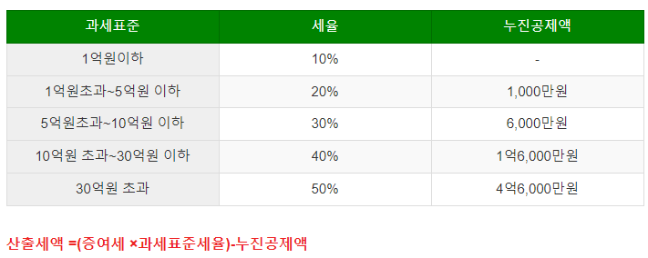증여세율의 과세표준 대상이 되는 금액은 1억원 이하부터 시작합니다. 그리고 구간별로 공제액이 있는데 증여금액에서 세율을 곱하고 누진공제액을 빼면 최종 산출세액이 계산됩니다.