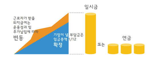 지금은 퇴직연금을 본인이 원하는 대로 DC/DB/IRP로 가입을 하셔서 미리 자금을 받아 운용을 하시거나, 단순하게 회사에서 적립을 해서 지급을 받을 수도 있습니다.