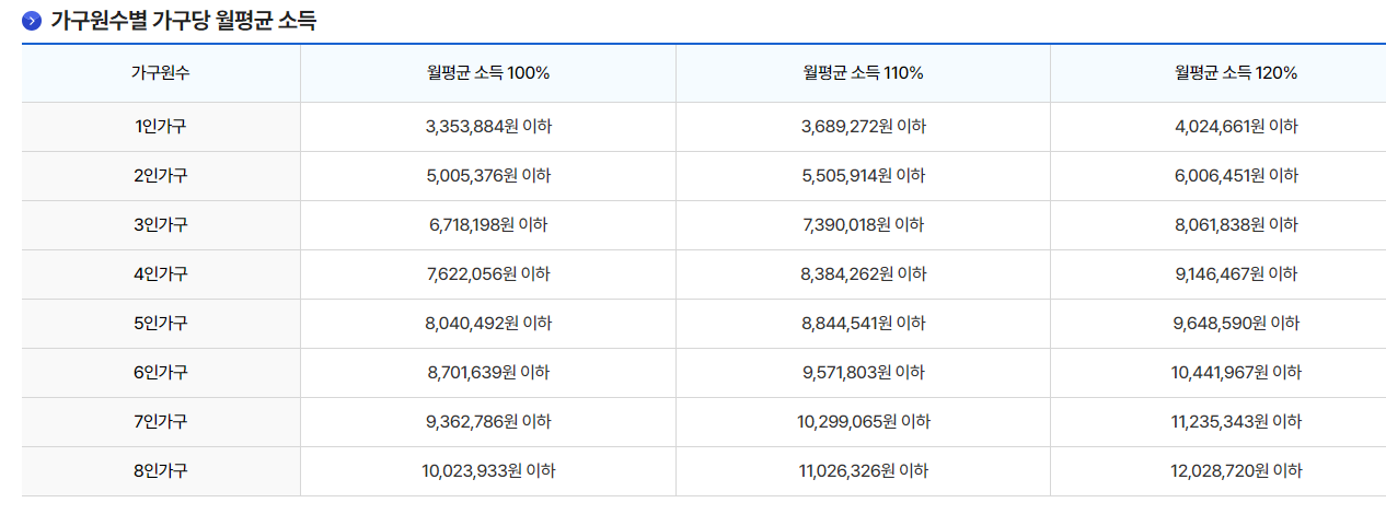 3인 가구 기준 월 소득 7,198,649원 이하, 1인가구 및 2인가구는 각각 소득 기준에 20%, 10% 가산 적용.